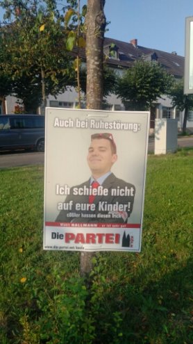 Kommunalwahl in Porz "Ich schiesse nicht auf eure Kinder!" .. diese Wahlwerbung von Satirepartei "Die Partei" zeigt, es hat sich viel verändert in den letzten 6 Jahren, bei der letzten Wahl wäre dieses Plakat nicht vorstellbar gewesen, nicht weil das Plakat schlecht wäre, sondern die Verhältnisse damals nicht so vergiftet und ethnisiert waren. Foto Jochen Geis